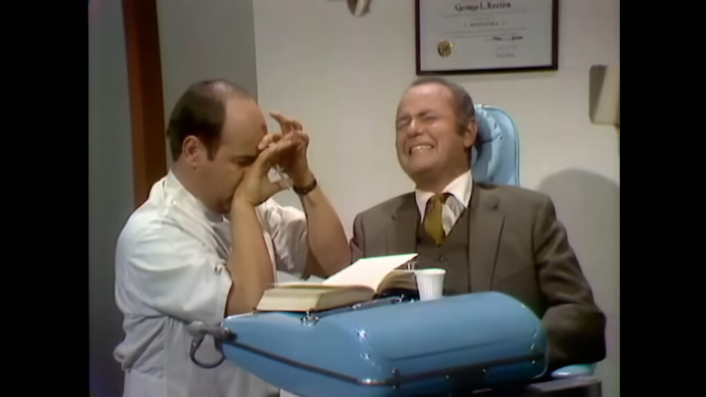 Conway is equally, if not more, nervous about attending to a patient. He musters the courage and decides to pull out Korman’s tooth as requested. What follows is a comedy of errors, starting with the incompetent dentist sticking the novocaine needle into his own skin, briefly paralyzing his right hand.